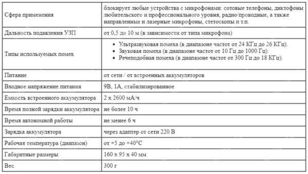 | Виды создаваемых помех | УЗ сигнал, звуковые колебания и речеподобную помеху; |